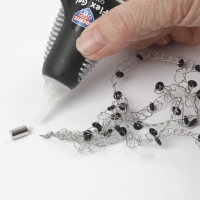 Sæt en klat lim i begge rør af magnetlåsen. Heri trykkes hvert endestykke af hæklingen og holdes i spænd, til limen er tør.